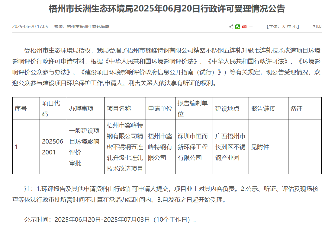 2025年6月20日,梧州市長洲生態(tài)環(huán)境局受理梧州市鑫峰特鋼有限公司精密不銹鋼五連軋升級(jí)七連軋技術(shù)改造項(xiàng)目環(huán)境影響評(píng)價(jià)行政許可申請(qǐng)材料并對(duì)外進(jìn)行公示,公示時(shí)間:2025年06月20日-2025年07月03日(10個(gè)工作日)。