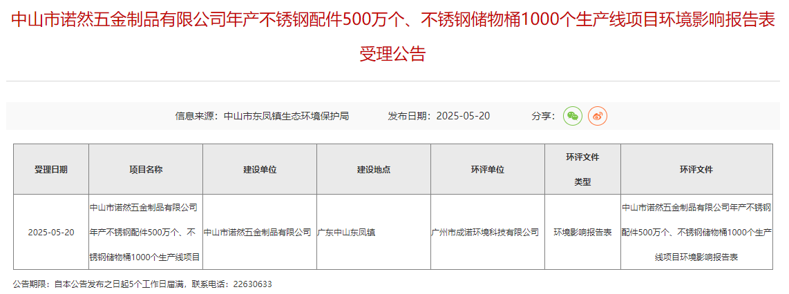 2025年5月20日,中山市東鳳鎮(zhèn)生態(tài)環(huán)境保護局受理中山市諾然五金制品有限公司年產不銹鋼配件500萬個、不銹鋼儲物桶1000個生產線項目環(huán)境影響報告表并對外進行公告,公告期:5個工作日。