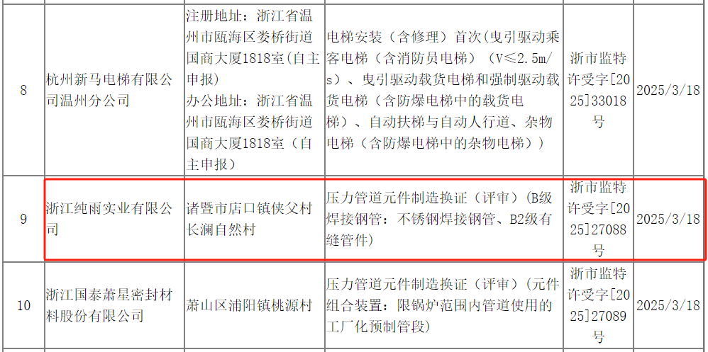 2024年3月24日,浙江省市場監(jiān)督管理局就特種設(shè)備許可受理情況(2025年第012批)對(duì)外進(jìn)行公告,據(jù)顯示,浙江純雨實(shí)業(yè)有限公司于3月18日申請(qǐng)壓力管道元件制造換證(評(píng)審)(B級(jí)焊接鋼管:不銹鋼焊接鋼管、B2級(jí)有縫管件)。
